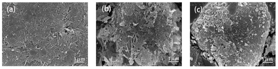 As shown in Figure 2a, the original structure of the sepiolite material is a thin straight rod-like fiber structure. In Figure 2b, the SEM image of the ABsep material obtained by treatment of sepiolite with hydrochloric acid and ammonia is shown. As can be seen, the surface of the composite is non-uniform, and the nanofibers are fragmented in comparison to the SEM image of the original sepiolite structure. With the massive structure, the dispersibility is reduced, the agglomeration appears, and the pores increase. The result is consistent with Figure 1. When compared to the surface without iron modification, the iron-modified HI/ABsep showed irregular ripples and a highly roughened surface (Figure 2c), which could be affected by hydroxyl iron.