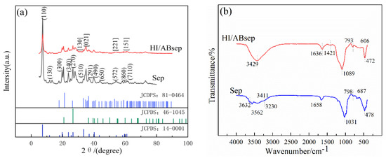 PXRD (a) and FTIR spectrum (b) of Sep and HI/ABsep. The red line in Figure 3a represents the XRD image of HI/ABsep, the black line is the XRD image of Sep, and the light blue refers to the data image corresponding to JCPDS:81-0464; Green is the data image corresponding to JCPDS:46-1045; The dark blue is the data image corresponding to JCPDS:14-0001. The red line in Figure 3b is the image produced by the infrared spectral data of HI/ABsep, and the black line is the infrared spectrum of Sep.
