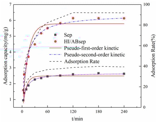 However, as shown in Figure 4, the amount of Sb (III) adsorbed by Sep and HI/ABsep increased rapidly and then stabilized. At 30 min contact time, the rate of Sb (III) removal by HI/ABsep had reached 67.28%. Within 30–120 min, the absorption rate of the material gradually decreases and tends to equilibrium, reaching an adsorption equilibrium at about 180 min. Sb (III) has a maximum adsorption capacity of 6.14 mg/g and a removal rate of 92%%, which is significantly higher than the original sepiolite (2.65 mg/g); the reason is that hydroxy-iron increases the number of active adsorption sites on the sepiolite surface and the adsorptive capacity is enhanced. The initial rapid adsorption may be due to the external diffusion of Sb (III), which is attached to the external surface of the material. Its main functions are ion exchange and physical adsorption. However, as time increases, on the one hand, the surface of the adsorbent can be used for the adsorption of Sb (III). However, as the concentration gradient of Sb (III) on the solution surface and adsorbent is reduced, the driving force for the concentration gradient decreases so that the resistance of the Sb (III) to adsorbate in solution increases, and the rate of adsorption slowly decreases [32,33].
