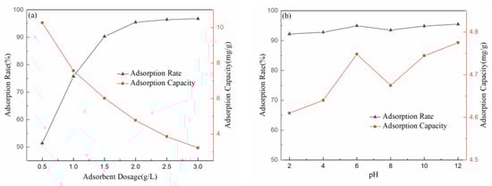 Effect of different dosages of adsorbent and pH change on Sb (III) adsorption. (a). Effect of different doses of adsorbents on the adsorption of Sb (III); (b). Effect of pH on the adsorption of Sb (III) by adsorbents.