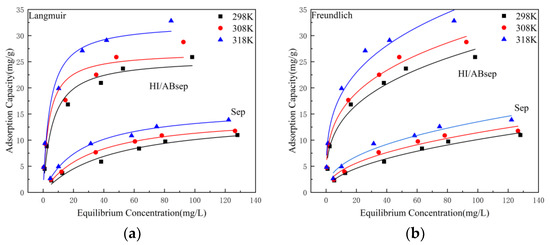 Sep and HI/ABsep (0.1 g) were added to a series of 50 mL solutions of Sb (III) (10, 20, 50, 80, 100, and 150 mg/L), respectively. The solution was placed in a box with constant-temperature gas bath agitation and stirred at 150 r/min for 240 min at a temperature of 298 K, 308 K, and 318 K, respectively. Sb (III) was measured by filtering the supernatant through a 0.45 μm membrane syringe filter.