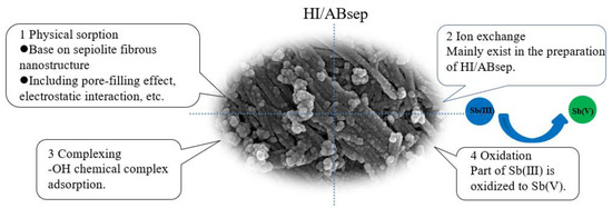 Briefly, the adsorption of HI/ABsep Sb (III) is mainly chemical and physical adsorption. HI/ABsep adsorption onto Sb (III) is a very complex process, which can be combined through a variety of adsorption mechanisms such as redox, coordination complexation, and physical adsorption. A schematic diagram of hydroxyl iron formation and the mechanism of enhanced Sb (III) removal by HI/ABsep can be seen in Figure 8. At pH = 2–10, the main forms of antimony in water are Sb (OH)3 and Sb (OH)6−. It is speculated that the surface complexation between antimony ions in the simulated water and the hydroxyl iron on the surface of HI/ABsep is shown in the following formula: