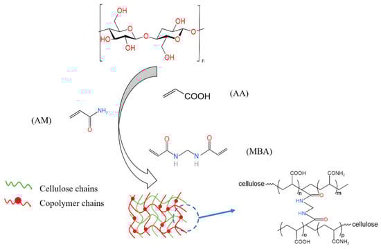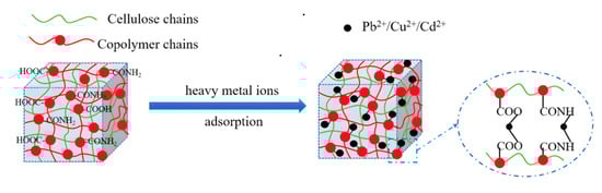 In recent years, as a bio-adsorbent for heavy metal removal, hydrogels have entered people’s vision due to their advantages of simple synthesis, convenient application, and wide selection of raw materials [39,40]. Unlike other adsorbents, hydrogels, a 3D network structure composed of hydrophilic polymer chains crosslinked either physically, chemically, or via polymerization, adsorb heavy metals in a three-dimensional and highly porous network [41]. Hydrogels can retain a large amount of water in a swollen state within their network from surface tension and capillary forces [42], leading to a high adsorption efficiency [43]. The adsorption or desorption of hydrogels for heavy metals is mainly due to the surface chemistry and presence of hydrophilic functional groups (−OH, −COOH, −CONH2, and −SO3H, etc.), which act as a complexing agent for heavy metals removal from wastewater [44,45]. Moreover, hydrogels can be modified with the addition of new functional metal absorption capacities or the preparation of composites with natural or synthetic sources such as cellulose [46] to enhance heavy metal adsorption capacities [47].