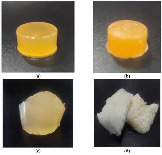 The photos of RIR/AA-co-AM hydrogel. Prepared RIR/AA-co-AM hydrogel (a); After ethanol dehydration (b); After soaking in DI water for 24 h (c); After freeze drying (d).