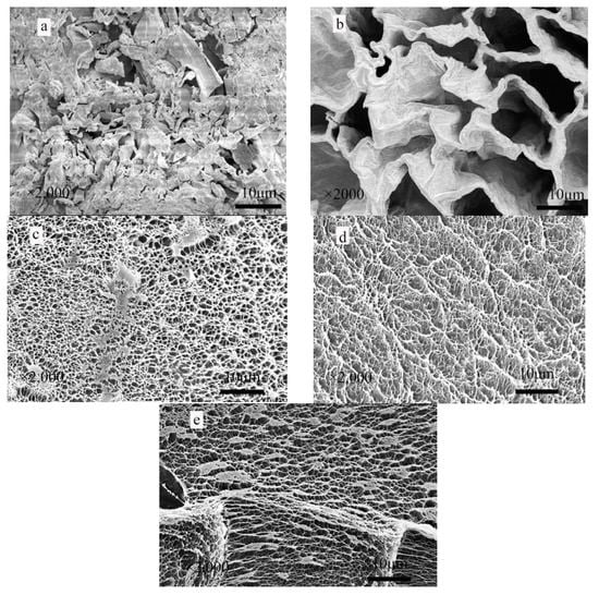 The surface morphology of RIR, RIR-NaOH, RIR/PAM3, RIR/PAA4, and RIR/AA-co-AM was analyzed by SEM, as shown in Figure 4. The RIR structure was relatively loose with few regular pores. Although RIR-NaOH has a few pores, they were larger than 10 μm which made the pollutants easy in and out, leading to a low adsorption capacity. Based on the structure of RIR and RIR-NaOH, their adsorption capacities for heavy metals were lower because cellulose is wrapped in lignin and is compact, resulting in low adsorption capacities and rates [46]. The porosity of hydrogel is a key factor attributed to its adsorption capacity [50]. Compared with RIR and RIR-NaOH, the hydrogels of RIR/AA-co-AM, RIR/PAM3, and RIR/PAA4 have sponge-like, three-dimensional, and highly microporous surface morphology. Among hydrogels, RIR/AA-co-AM has a regular porous and rough structure that significantly differs from RIR/PAM3 and RIR/PAA4 hydrogel. The average pore size of RIR/AA-co-AM in diameter is about 3 μm, slightly larger than RIR/PAM3 and RIR/PAA4, which can provide more adsorption sites for heavy metal ions and improve the overall adsorption performance. The hydrogel RIR/PAA4 has a highly porous structure, leading to a higher adsorption capacity than RIR/PAM3. The main reason that the pores developed in the hydrogel would improve the adsorption performance is that the pores can permit guest molecules such as water and heavy metals to move across the composite structure [51].