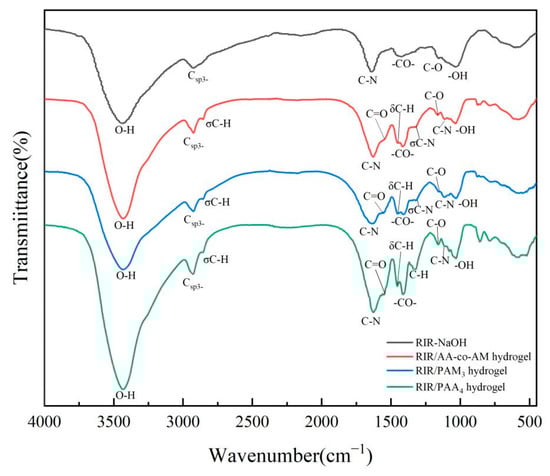 Various functional groups in hydrogels were determined by FTIR, as shown in Figure 5. The absorption band around 3430 cm−1 is related to the O-H bond [16], the sharp peak at 2927 cm−1 is related to the Csp3- stretching vibration [52], the peak at 1623 cm−1 is the stretching of the C-N bond, the peak at 1413 cm−1 is related to the stretching vibration of the -CO- bond in the phenyl hydroxyl group in lignin, the peak at 1314 cm−1 is the C-N absorption band (amide III band), the peaks at 1158 cm−1 are attributed to the stretching vibration of the ester bond in the cellulose ester group [16], the peak at 1030 cm−1 is attributed to the bending vibration of the hydroxyl group [53], and the characteristic peaks of cellulose still exist in RIR/AA-co-AM, RIR/PAA4, and RIR/PAM3 hydrogels. The peak at 2852 cm−1 is the characteristic absorption peak of methylene symmetry stretching vibration, and 1454 cm−1 is the characteristic absorption peak of methylene deformation [54], the vibration peak of C=O at 1561 cm−1, the absorption peak at 1119 cm−1 is related to the C-N stretching vibration, these characteristic peaks are all from polyacrylamide and polyacrylic acid. It can be seen that AA and AM were successfully introduced onto RIR-NaOH by graft copolymerization.