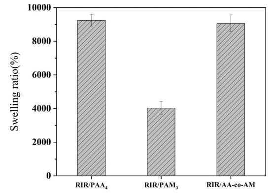 Figure 6 shows the results of the swelling properties of different hydrogels. RIR/PAA4 and RIR/AA-co-AM had the highest swelling rate (9240%) due to numerous hydrophilic functional groups (e.g., –OH, −COOH, −NH2), which enable the adsorption and retention of a large volume of water. After introducing CONH2, the swelling ratio (9064%) of RIR/AA-co-AM and RIR/PAM3 were all lower than that of RIR/PAA4, and RIR/PAM3 had the lowest swelling rate (4024%) because the hygroscopicity of COOH is higher than that of CONH2 on the surface of RIR/AA-co-AM and RIR/PAM3 [55]. Although RIR/PAA4 has the best swelling ratio among the three hydrogels, it could not maintain its form in the process of adsorption.