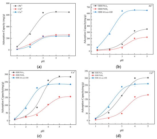 From Figure 7b–d, RIR/PAA4 and RIR/PAM3 reached the maximum adsorption to heavy metals at pH 4. At pH 3, the adsorption capacity of RIR/AA-co-AM for Pb2+ could reach 655.38 mg/g at equilibrium, which was higher than those of Cd2+ (219.13 mg/g) and Cu2+ (242.79 mg/g). It might be because numerous functional groups -CONH2 [60] and -COOH [61] on RIR/AA-co-AM surface have more selective adsorption to Pb2+. Figure 7c,d show that the RIR/AA-co-AM also had a better adsorption effect on Cu2+ and Cd2+ ions, which could reach 242.79 mg/g and 260.69 mg/g, respectively. The high uptake of Cu2+ and Cd2+ of RIR/PAA4 may be attributed to the electrostatic attraction between the Cu2+ and Cd2+ ions and the negatively charged binding sites, as ligands such as carboxyl, hydroxyl, and amino groups were free to facilitate interactions with metal cations [62]. However, RIR/AA-co-AM had a better adsorption effect on Cu2+ and Cd2+ ions which could reach to 284 mg/g and 303 mg/g. It might because the electrostatic interaction between RIR/PAA4 and Cu2+ or Cd2+ ions is stronger than RIR/AA-co-AM and RIR/PAM3 at pH 4. In the following study, pH 4 was chosen as the appropriate pH for RIR/PAA4 and RIR/PAM3 to remove heavy metals ions.