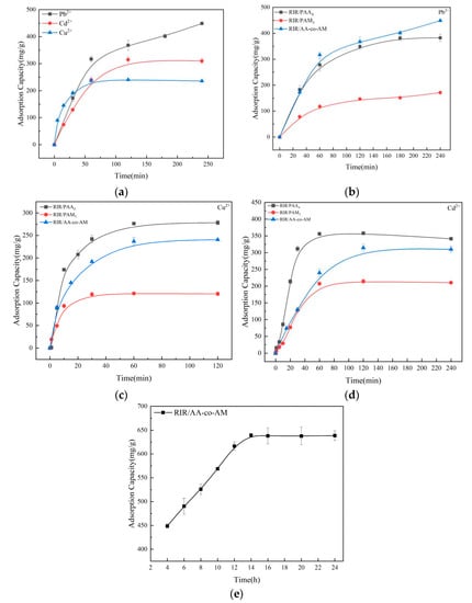 Effects of contact time for Pb2+, Cu2+, and Cd2+ on hydrogels. Adsorption conditions were at absorbent = 0.02 g, T = 25 °C and pH = 3 for RIR/AA-co-AM, pH=4 for RIR/PAA4 and RIR/PAM3. Adsorption capacity of RIR/AA-co-AM for Pb2+, Cd2+, and Cu2+ (a); Adsorption capacity of three hydrogels for Pb2+ (b); Adsorption capacity of three hydrogels for Cu2+ (c); Adsorption capacity of three hydrogels for Cd2+ (d); Adsorption capacity of RIR/AA-co-AM for Pb2+ after 4 h (e).