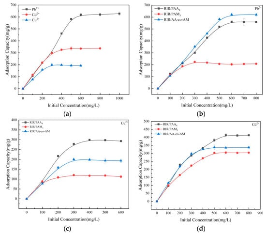 Effect of initial concentration on Pb2+, Cu2+, and Cd2+ adsorption. Adsorption conditions were at absorbent = 0.02 g, T = 25 °C, pH = 3 for RIR/AA-co-AM, pH = 4 for RIR/PAA4 and RIR/PAM3, and t = 8 h. Adsorption capacity of RIR/AA-co-AM for Pb2+, Cd2+, and Cu2+ (a); Adsorption capacity of three hydrogels for Pb2+ (b); Adsorption capacity of three hydrogels for Cu2+ (c); Adsorption capacity of three hydrogels for Cd2+ (d).