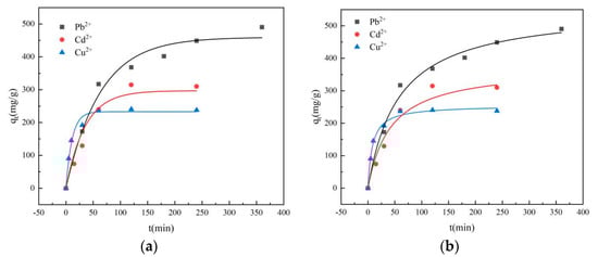 Pseudo-first-order (a), pseudo-second-order (b) kinetic model on heavy metal ions adsorption.