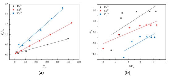 where qe (mg/g) is the equilibrium adsorption capacity, Ce (mg/L) is the equilibrium concentration, KL is the Langmuir constant, qm (mg/g) is the maximum adsorption capacity covering the entire surface, RL is the separation coefficient or equilibrium parameter, C0 (mg/L) is the initial concentration of heavy metal ions, and KF and n are the Freundlich constants.