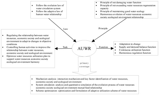 However, they are all water resources adaptation responses and strategies proposed in response to environmental changes, without proposing water resources development and utilization strategies from the general height of the reciprocal feedback between water resources systems and environmental changes, and have not yet risen to a water resources adaptation and utilization model. Based on this, Zuo elaborated on the AUWR model, the theoretical system framework, and its application issues, and defined the concept of AUWR, the process of water resources development and utilization, following the laws of nature and social development, adapting to the impact of environmental changes such as human activities, climate change, and land surface changes, and ensuring the virtuous cycle of water systems, the chosen water resources utilization [24,25,26]. On this basis, the concept of adaptive utilization capacity of water resources (AUCWR) is proposed—under the guidance of the theory of adaptive utilization of water resources, based on the evaluation system of AUWR, the effect and overall level of AUWR obtained through quantitative evaluation method.