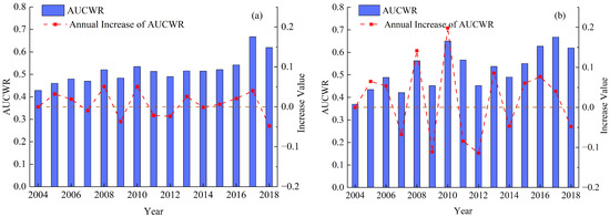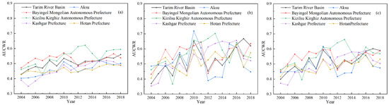 Using the two methods, by analyzing the AUCWR in the five prefectures (Aksu, BMAP, KKAP, KP, and HP regions) belonging to the TRB from 2004 to 2018, we obtained the trend graph of the AUCWR in each prefecture, as shown in Figure 6a,b, and combined the results of the two calculations to obtain the trend graph of the AUCWR in each prefecture, as shown in Figure 6c.
