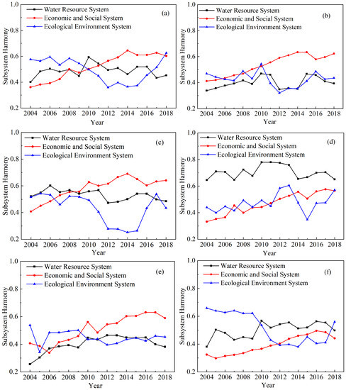 Figure 7a confirms the adaptability of each subsystem in the TRB, which ranges from 0.4 to 0.6, indicating that the adaptability of each subsystem is at a medium level in the study area. From 2004 to 2018, the change in the adaptability of the water resources system is small (average annual growth rate of 5.2%), and although the water resources subsystem reveals an upward trend, the trend is not obvious, and by 2018, the adaptability of the water resources subsystem is significantly lower than that of the economic and social and ecosystem subsystems. It can no longer meet the needs of economic and social development and ecological protection. During 2004–2018, the economic and social subsystem adaptation degree indicates a rapid upward trend (average annual growth rate of 24%), and the level of economic and social development steadily increased during this period, but after 2014, it decreased, which may be due to the fact that with the increase of ecological environmental protection, the development of certain environmentally crude enterprises is restricted to a certain extent, which caused the growth of economic and social development certain impact, but generally speaking, the momentum of economic and social development is good. During the period of 2004–2014, the adaptability of the ecological and environmental subsystem indicates a decreasing trend (the average annual decrease rate is 21%), but during the period of 2014–2018, the adaptability of the ecological and environmental subsystem indicates an upward trend and an obvious upward trend (the average annual growth rate is 26%). It indicates that before 2014, the economic and social development of the TRB might be to a certain extent at the expense of the ecological environment. Strongly affected by human activities, the ecological environment is damaged to some extent, the ecological environment is becoming worse and worse, the ecological carrying capacity is gradually increasing [46], and the research shows that the changes in human activities and climate have a significant impact on the ecological environment and oasis changes in the TRB [47]. With the introduction of the policy of ecological protection, the ecological environment is obviously improved and implies a good development trend after increasing ecological protection and management.