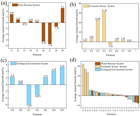 Average annual growth rate of each subsystem element. (a–c): the average annual growth rate of three subsystems. (d): ranking of average annual growth rate of three subsystems.