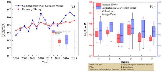 The AUCWR in the TRB is calculated by the harmony theory method and the comprehensive co-evolutionary model method, and the results are compared and analyzed as shown in Figure 9. According to Figure 9, the range of AUCWR in the TRB calculated by the two methods is not very different, with the range of 0.4–0.6 for the harmony theory calculation and 0.33–0.67 for the coevolutionary model method. The results calculated by both methods show a fluctuating upward trend from the overall time period of 2004–2016, followed by a consistent trend every two years, such as a gradual increase from 2004–2006, a fluctuating trend from 2006–2011, and then a gradual increase from 2012–2016. Taken together, the results of AUCWR calculated by the two methods can corroborate each other and increase the reliability of the results. Further, from the viewpoint of the magnitude of change, the harmony theory method has a small change and shows a steady upward trend overall, with the largest change in the two time periods of 2007–2008 and 2009–2010, with a change of 10.9% and 9.7% respectively. The comprehensive co-evolutionary model method has a larger change, and overall, the change from 0.34 in 2004 to 0.58 in 2016 is 0.22, which is much larger than the change value of 0.11 for the harmony theory method. Among them, the comprehensive co-evolutionary model method has the largest change before and after 2010, and the change before and after is 48.8% and 22.6%, respectively. Continuing to analyze the calculation results of the two methods in each region of the TRB, the mean values calculated by the comprehensive co-evolution model method are both higher than those calculated by the harmony theory, but the calculations are closer and the differences are not significant. While the fluctuation ranges are both larger than those calculated by the harmony theory method.