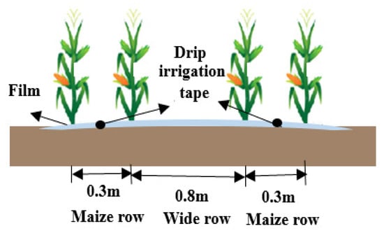 A joint planter was used to lay drip tapes, film, and sow. Its planting density was 1.26 × 105/hm2 in the experiment. The plants were sown with alternating wide and narrow rows of 0.8 and 0.3 m. The spacing between plants within a row was 14.4 cm (Figure 2, the spacing between the drip tapes was 110 cm).