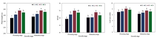 Leaf area index (LAI) [27]: ten plants with similar growth vigor were randomly selected from each treatment at flowering and maturity stages. Leaf area: using destructive sampling, the length and width of the leaves were measured with a tape measure, then multiplied by 0.75 to calculate the leaf area per plant.