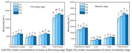 Dry matter accumulation of maize under drip irrigation quotas: Left is dry matter accumulation of maize at flowering stage; right is dry matter accumulation of maize at maturity stage. Note: Different lowercase letters indicate that the dry matter of each part of the maize at the same growth period is significantly different between different treatments.