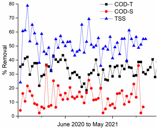 Removal efficiency of COD-T, COD-S and TSS in pilot-scale BEPT process.