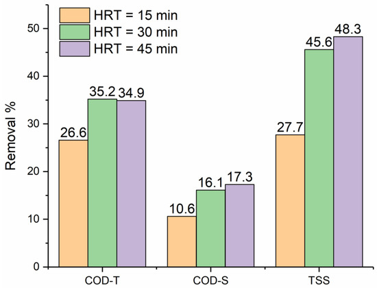 There was a significant improvement in the performance of the pilot-scale BEPT process when the HRT in the contact tank increased from 15 min to 30 min, but there was only a marginal improvement in COD-T, COD-S and TSS removal with a further increase in HRT to 45 min. It can be seen from Figure 3 that a 10% increase in COD-T was observed for HRT of 30 min compared to HRT of 15 min, while no further improvement was observed when the HRT was increased from 30 and 45 min. The trend was similar for COD-S, where approximately 6% more soluble COD was removed when doubling HRT from 15 to 30 min. On the other hand, TSS removal was very low in the case of 15 min HRT compared to HRTs of 30 and 45 min. A lower HRTs in the contact tank also reduce the degree of mineralization and maximize the organics redirected to the sludge via biological flocculation, sorption, and storage mechanisms [10,14]. Higher flow rates effectively increased the hydraulic loading rate (HLR) in DAF tank, which may have had a negative effect on floc formation due to turbulence in the DAF tank in the absence of any chemical dosing. The hydrodynamics of a flotation, including bubble rise velocity, is the key factor deciding the collision and attachment efficiency of solid particles. This affects the overall separation efficiency of a micro-bubble flotation system. If the rise velocity is too high, it will result in high turbulence and can break bubble-floc particles, which could result in low separation efficiency [33,35].