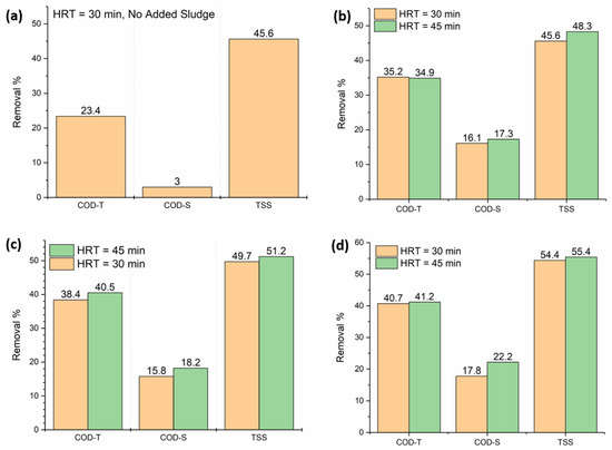 Four different AS loadings, i.e., 0 mg/L, 60 mg/L, 80 mg/L and 100 mg/L, were selected based on the quantity of waste-activated sludge available from the SWRRF. It can be seen from Figure 4a that, without any AS addition, there was a slight removal of soluble COD (approximately 3%), while COD-T and TSS removals were 23% and 46%, which is comparable to PT. Moreover, at a low AS loading, i.e., 60 mg/L, COD-T and COD-S removals were enhanced by 12 and 13%, respectively, while there was no significant difference in TSS removal compared to the results without any AS addition. Increasing the AS loading to 80 mg/L (Figure 4c) further improved COD-T, COD-S and TSS removals. The highest AS loading of 100 mg/L showed further improvements, with average removals of 41% for COD-T, 22% for COD-S and 55% for TSS (Figure 4d).