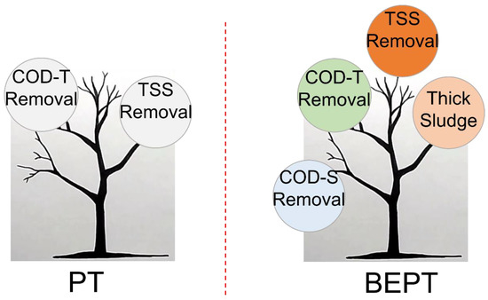 Overall, BEPT has higher capabilities compared to conventional PT. In BEPT-enhanced COD-T, COD-S and TSS removals, owing to quick HRT (30–45 min) and mild aeration (DO = 1 mg/L), enhanced removal efficiencies were found compared to PT. Moreover, the sludge produced from BEPT contained a high solid content (4.8 g/L), which may not require further thickening prior to introducing into an anaerobic digestor for biogas production. A graphical/schematic comparison between the BEPT and PT is shown in Figure 5.