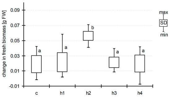 Change in biomass of Lemna minor between D01 and D07 (means with the same letters did not differ significantly; post hoc Duncan’s test at p < 0.05).