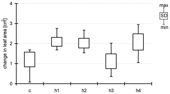 Generally, we observed an increase in Lemna biomass during exposition in all treatments including the control ones. The starting biomass in all treatments and the control was very similar and ranged between 0.085 g and 0.086 g FW per jar (on average). At the end of experiment, in the control and treatments h1, h3 and h4, the increase in frond biomass was about 0.02 g per 7 days (0.018 ± 0.022, 0.021 ± 0.025, 0.021 ± 0.013 and 0.019 ± 0.022, respectively, Figure 1), suggesting that humic acid addition had no impact on Lemna biomass. In the h2 treatment (TOC concentration 21.6 ± 0.4 mg dm−3 at D0), the biomass increase was at least twice as great and amounted to 0.056 ± 0.013 g per 7 days. Analysis of variance did not show significant differences between treatments at D07, although post hoc Duncan’s test demonstrated that the mean biomass of L. minor in h2 varied significantly from that in all the other treatments (Figure 1). Humic acid addition also affected the increase in leaf area in all treatments (0.8–0.9 cm2 per 7 days as compared to control jars) with the exception of h3, but the observed differences were not significant (ANOVA at p < 0.05) (Figure 2). A more explicit reaction to the HA addition after seven days of exposition was seen in the case of Lemna root lengths (Figure 3). We did not observe differences between that of h1 and control jars (22.5 ± 3.6 mm and 21.6 ± 7.9 mm, respectively). In the h2 treatment, the length of the roots increased (31.0 ± 2.2 mm), while, in the h3 and h4 treatments with the highest addition of HA, one could observe a decrease in this parameter (18.4 ± 2.9 mm and 14.0 ± 2.3 mm). The differences were statistically significant (ANOVA, F = 57.05, p < 0.001).