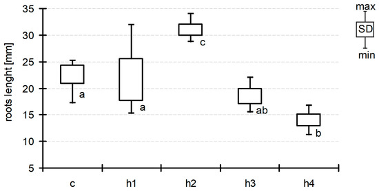 The length of roots of Lemna minor at the end of the experiment (means with the same letters did not differ significantly; post hoc Duncan’s test at p < 0.05).