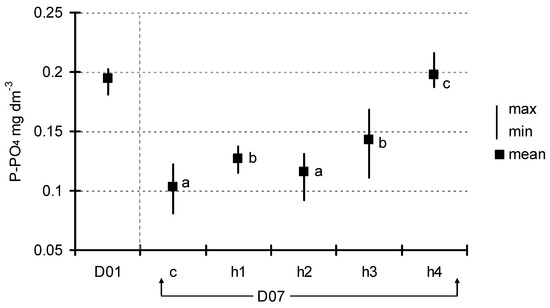 Change in P-PO4 concentration between D01 and D07 (means with the same letters did not differ significantly; post hoc Duncan’s test at p < 0.05).