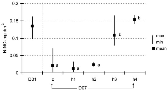 Change in N-NO3 concentration between D01 and D07 (means with the same letters did not differ significantly; post hoc Duncan’s test at p < 0.05).