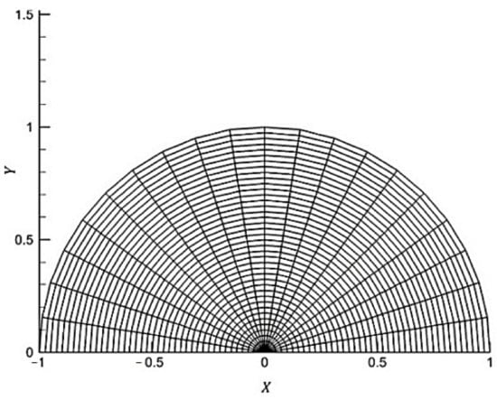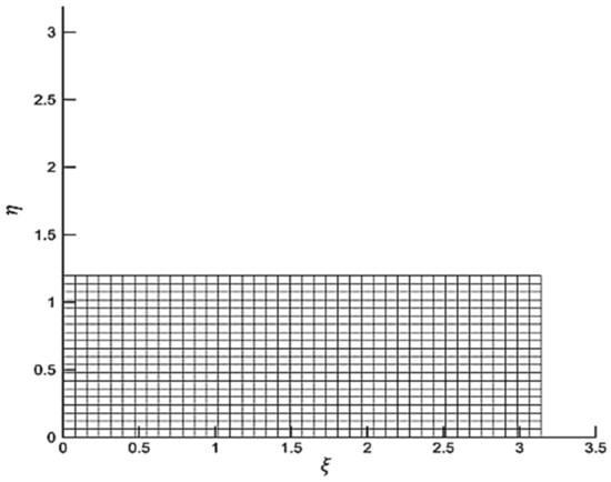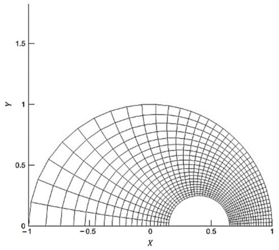 and are the metric forms of the physical domain transform into the computational domain. is the jacobin, and and are defined velocity in the computational domain. The values of and and are shown in Table 2. In order to evaluate the conservation equation in the computational domain, the Cauchy–Riemann equations used in analytical conformal mapping are applied. The Cauchy–Riemann equations are shown as follows.