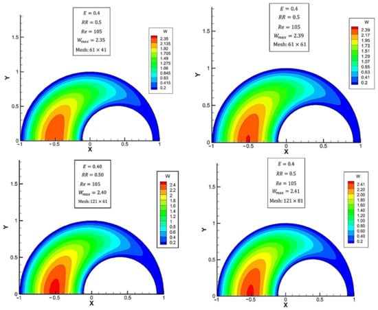 The developed velocity contours in the space of two cylinders with various grid numbers are illustrated in Figure 8. Accordingly, it can be seen that the velocity contours for the two cases with 121 × 61 and 121 × 81 grids are similar, and the maximum velocities in these two cases are very close to each other. Therefore, the best grid in the case of space between two eccentric cylinders (domain 1) is 121 × 81.