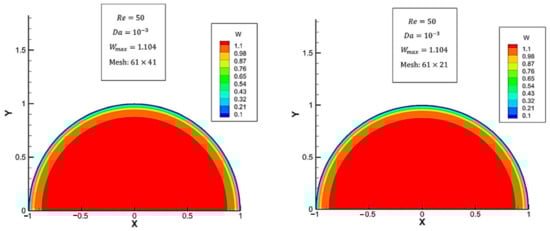 The same analysis was carried out for the second computational domain: the case of a tube completely filled with a porous medium for two different grids. The developed velocity contours in this case are shown in Figure 9. As can be seen, the fluid flow gives exactly the same answer for the two different grids. Of course, these results were obtained for grids with a larger first component, and there was no difference in the shape of the contours and the maximum velocity; therefore, the best grid in domain 2 (related to the porous area) is considered to be 61 × 41. However, as the peripheral components of the grids in the computational domains 1 and 2 must be equal, we ultimately applied the 121 × 41 grid.