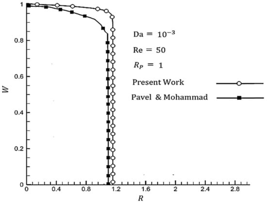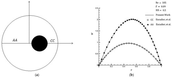 The momentum equation for axial flow between two eccentric cylinders is compared with the results of Escudier et al. [33]. The geometry of the specific cross-section of the previous study is schematically shown in Figure 10a. The axial velocity obtained is compared with the results of [33] presented in Figure 10b. It can be seen from Figure 10b that good agreement exists between the model calculation results and the literate values. Figure 11 compares the velocity profile for the fully filled porous medium in the present paper and the experimental values of Pavel and Mohmmad [12]. Due to this symmetry, only half of the full geometry is calculated.