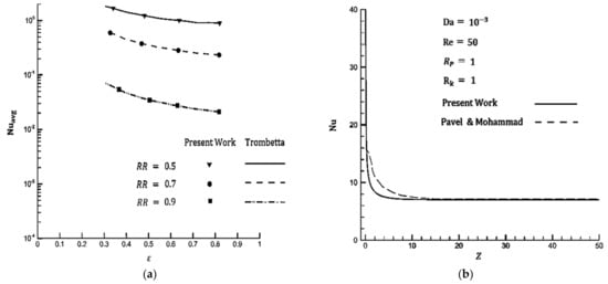The average Nusselt number in annuls calculated for various eccentricities is compared with the results of [34] in Figure 12a. It is evident that the present model provides consistent results with the literature. In addition, a comparison between the local Nusselt numbers in a tube fully filled with a porous medium with Pavel and Mohmmad [12] is shown in Figure 12b.