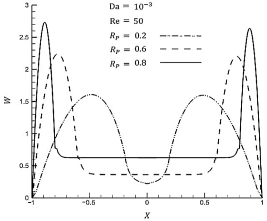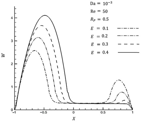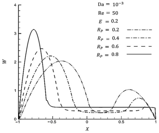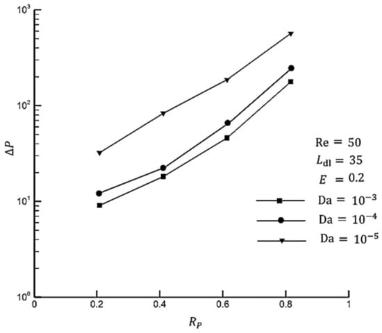 It is evident from Figure 18 that the pressure drop increases while the Darcy number falls. This is because the permeability of the porous medium decreases at smaller Darcy numbers. In addition, Figure 18 illustrates that, while eccentricity grows, the pressure drop decreases, with a greater decrease in lower Darcy numbers. For instance, pressure drop decreases at and . Therefore, a large pressure drop, which is one of the main problems of using porous media, can be reduced by applying an eccentric porous medium inside. Figure 19 shows that by increasing the thickness of the porous medium in the pipe, the pressure drop increases. This is due to the resistance that the solid part of the porous material creates against fluid motion.