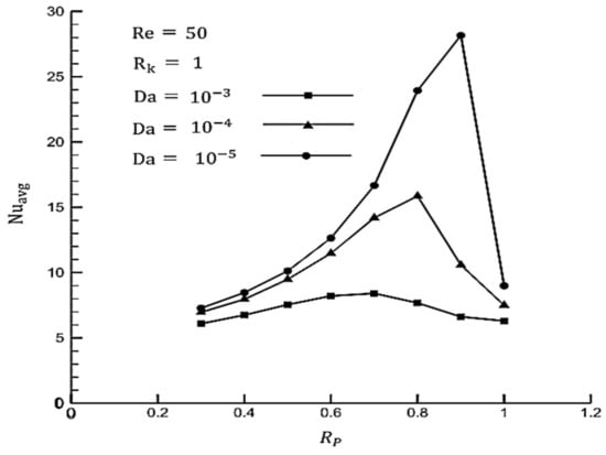 - A smaller Darcy number leads to a higher heat transfer rate in the concentric position. In addition, the highest average Nusselt number can be achieved at a specific thickness, which is considered to be the optimum thickness for a given Darcy number. Optimum thicknesses in the range of 0.7–0.9 increase with a decreasing Darcy number.