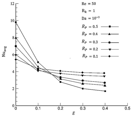 Figure 20 shows that the eccentricity of the porous media has a significant effect on the average Nusselt number. It should be noted that the average Nusselt number experiences a significant decrease when an eccentric porous media is employed, with an even higher decrease in larger thicknesses. For example, a reduction in the average Nusselt number is caused by adding eccentric porous media, where . Accordingly, it is not recommended to employ eccentric porous media at large thicknesses. As shown in Figure 20, at larger values of eccentricity, the average Nusselt number decreases at a smaller rate. Thus, it is beneficial to increase the eccentricity of porous media, as this leads to a smaller pressure drop and has an insignificant impact on the average Nusselt number, according to Figure 18, where eccentricity is greater than 0.3 of the outer pipe radius.