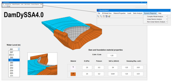 DamDySSA is a 3D finite element program for dynamic analysis of concrete dam–reservoir–foundation systems. Several years in development in LNEC, the latest version of the program includes calculation modules for modal analysis, linear seismic analysis, and non-linear seismic analysis [62]. Figure 4 shows the graphical user interface designed for the program in MATLAB. The coupled finite element formulation and the numerical method for non-linear seismic analysis are summarized in the following sub-sections.