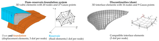 In this program, the dam–reservoir-foundation system is discretized using solid hexahedral finite elements with 20 nodes; these are isoparametric elements, and integration is achieved with 2nd degree interpolation functions and 27 Gauss points. The main discontinuities, e.g., dam–foundation interface, joints, or cracks, are discretized using compatible interface elements with 16 nodes and 9 integration Gauss points (Figure 5).