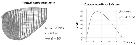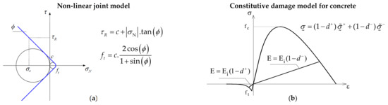 In DamDySSA, the stress-transfer iterative process is conducted in each time step t+Δt, being divided into two iterative sub-processes: the first, to simulate the effects due to joint movements, and the second, to model the concrete behavior up to failure under tension and compression [62]. Therefore, the unbalanced forces that arise in the iterative process are associated with the unbalanced stresses due to joint and concrete non-linear behavior. The unbalanced stresses are computed as the difference between the installed stresses and the material strength, considering the following constitutive models (Figure 6). The non-linear joint behavior is simulated using a constitutive model based on the Mohr–Coulomb failure criterion (Figure 6a), with or without cohesion, and considering appropriate normal/shear stress-displacement laws to account for opening/closing and sliding movements [55,56], and (ii) the concrete behavior up to failure is reproduced using a 3D isotropic damage model with strain-softening and two independent scalar damage variables, d+ for damage under tension and d− for damage under compression [82,83] (Figure 6b).