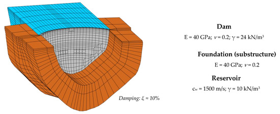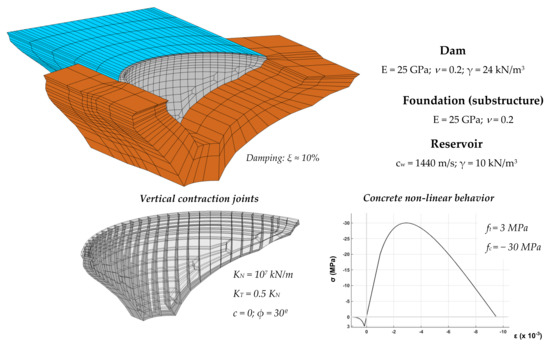 Large concrete dams are usually structures with unique and complex geometry, particularly in the case of arch dams, and they may have different types of discontinuities, including construction joints or concrete cracking. Furthermore, the dynamic behavior of dams is strongly influenced by the interaction with the reservoir and the foundation [33,34]. Therefore, for simulating the dynamic behavior of concrete dams it is essential to develop robust models of dam–reservoir–foundation systems (Figure 1), considering the specific features of the dam structure and multiple dynamic effects, such as dam–water interaction, pressure wave propagation in the reservoir domain, dam–foundation interaction, the behavior of the rock mass, and damping mechanisms, including viscous damping in the dam and radiation damping in the reservoir and foundation; these are factors that can have a significant influence in the overall seismic behavior of the dam [18,19].