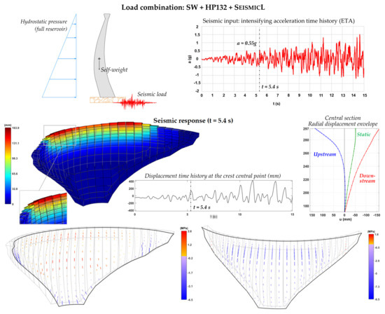 The studies for seismic safety assessment of dams are usually conducted by performing multiple time history seismic analyses, using appropriate acceleration time histories, to simulate both common service scenarios and failure scenarios. The seismic response analyses can be carried out using one or multiple (with distinct frequency content) generated accelerograms, which are scaled to obtain seismic loads with various peak ground accelerations, corresponding to weaker or stronger ground motions. This methodology is according to the principals of Incremental Dynamic Analysis [73], and it has allowed researchers to obtain valuable results and draw assertive conclusions on the seismic capacity of large concrete dams; several application examples can be found in studies for gravity dams [61,74] and arch dams [75,76]. The obvious disadvantage is the need to conduct multiple calculations for different seismic excitation levels, resulting in longer calculation times to investigate different scenarios, particularly if non-linear analyses are required.