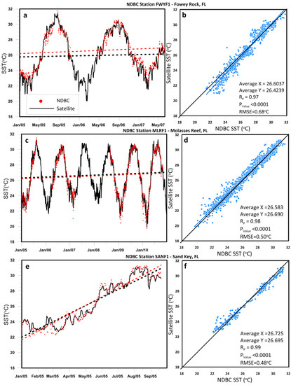 (a) Daily evolution of Sea Surface Temperature (SST; °C) derived from the satellite data (black line) and the NDBC Stations (red dots) (a) FWYF1 (coastal area of Miami), (c) MLRF1 (Upper-Keys), and (e) SANF1 (Lower-Keys). The respective scatter diagrams (b,d,f) between the two timeseries for each case are also shown. The linear regressions (trends and timeseries comparison), the mean values, the Pearson correlation coefficients (Rp), the tests of statistically significant correlation (pvalue), and the Root Mean Square Errors (RMSEs) for all cases are presented.