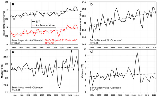 Annual variability (continuous lines) and trends (dashed lines) of: (a) the mean sea surface temperature (SST; °C) and air temperature (Air Temp; °C); (b) the 99th percentile of SST; (c) the minimum (min) SST; and (d) the variance, averaged over the entire study domain (Figure 1) for the period 1982–2021. The Sen’s Slope and coefficient of determination (R2) for each trend are presented. The asterisk (*) indicates that the hypothesis that the trend is statistically significant is true (99% MK test of statistically significant trend: pvalue < 0.01).