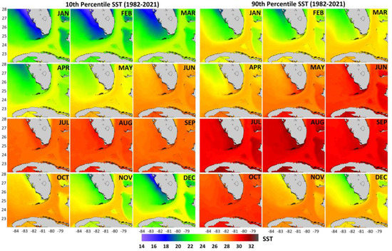 The spatial variability of the seasonal 10th and 90th percentiles is presented in Figure 4. The 10th percentile represents the 10% chance that the temperature fell below this threshold during the study period; anything below the 10th percentile is considered unseasonably cool. Very low temperature levels, associated with cold water events, may have fatal consequences on coral communities [22] but may also reduce the occurrence frequency of the MHW events during the winter months [12]. The 90th percentile describes the 10% chance that SST was above this threshold, and anything above it is considered unseasonably warm. The monthly 90th percentile was used as the temperature climatology (threshold) for the MHW computation (see Section 3.4). The colder waters have been detected over the entire WFS between January and March (<17 °C; Figure 4), while very low SST also occurred along the western Florida coast in December. Over the same areas and months, the 90th percentiles were relatively low (<24 °C) revealing their lowest values between the coastal region of Tampa (28° N) and Fort Myers (26° N). The highest 10th and 90th percentile values were computed during July-September for the entire study domain; especially the 10th percentiles were homogenously distributed over all areas. The maximum 90th percentiles were computed over the southern WFS (>31 °C), and especially along the northern coasts of the Florida Keys during the summer months and early fall. The high 90th percentiles are an indicator that the detected MHWs over these areas are characterized by unusual high SST levels (see Section 3.4). The open waters of the Straits of Florida were characterized by high 90th percentiles during winter and spring but lower levels than the WFS and EFS areas during the summer months, due to the FC evolution that controls the distribution of physical properties over the Straits (see Section 4.2). Two distinctive seasonal changes are detected during the annual cycle: one during June, when both 10th and 90th percentiles revealed a strong increase over the entire study domain, and a second in November, when both metrics showed significant reductions.