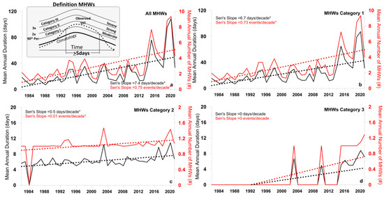 (a) Interannual evolution of the mean annual number of all Marine Heat Waves (MHWs; red line) and the mean annual duration (days; black line) derived from all satellite daily data at each satellite grid point of the study area for the 1982–2021 period; the insert panel presents the categorization schematic for MHWs showing the observed temperature timeseries (dashed line), the long-term regional climatology (bold line), and the 90th percentile climatology (thin line). Multiples of the 90th percentile difference (2× twice, 3× three times) from the mean climatology value define each of the Categories 1–3, with corresponding descriptors from moderate to severe [2]. The individual evolution of the mean annual number and duration of MHWs for Category 1, 2, and 3 are presented in (b–d), respectively. The zero MHW cases were not included in the calculations. The linear trend (dashed line), the Sen’s Slope, and the respective test of statistically significant trend (pvalue) for each case are presented. The asterisk (*) indicates that the hypothesis that the trend is statistically significant is true (99% MK trend test: pvalue < 0.01).
